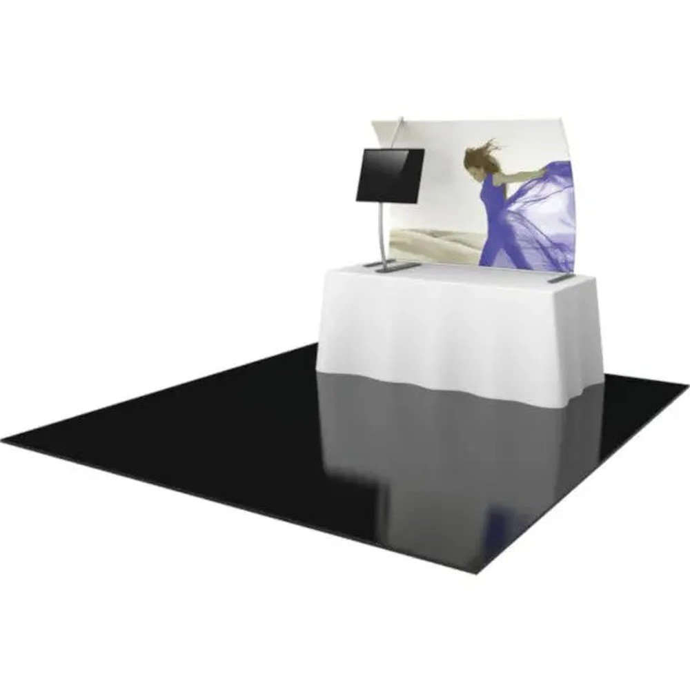 The Formulate 6′ Master Tabletop TT3 is a vertically curved tabletop display with curved monitor mount and flat feet in the back for added stability. Fits on a 6′ wide table. Kit includes: 1 Frame w/monitor mount, 1 Dye-Sublimated graphic, and 1 Molded OCS Trade Show shipping case.