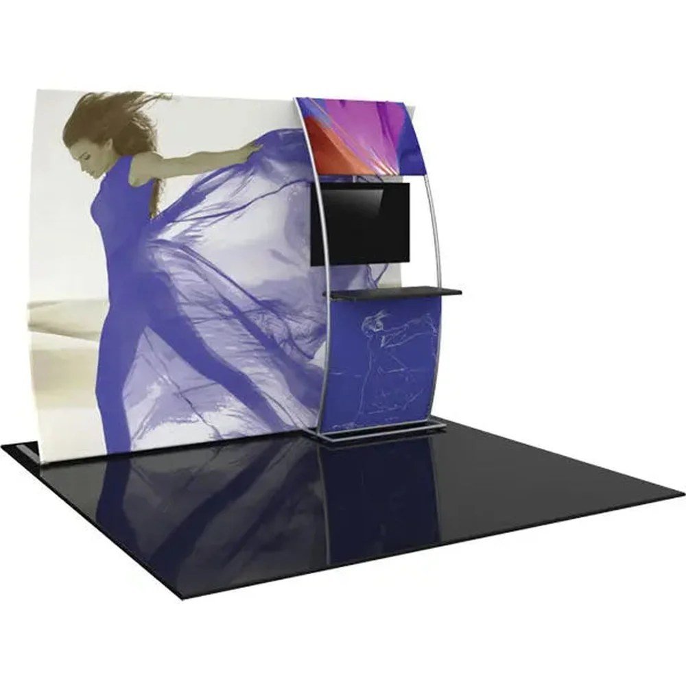 The Formulate 10′ Master V7 Vertical Curved Fabric Backwall is a vertically curved floor-height display with side graphics ladder, counter and medium monitor mount.  Kit includes:  1 Frame, 1 Dye-Sublimated graphic, 1 Side Curved Ladder Graphic, 1 Stand-off counter in 4 color options, 1 Medium Monitor Mount and 1 Molded OCH2 Storage Case + 1 OCL large shipping case.