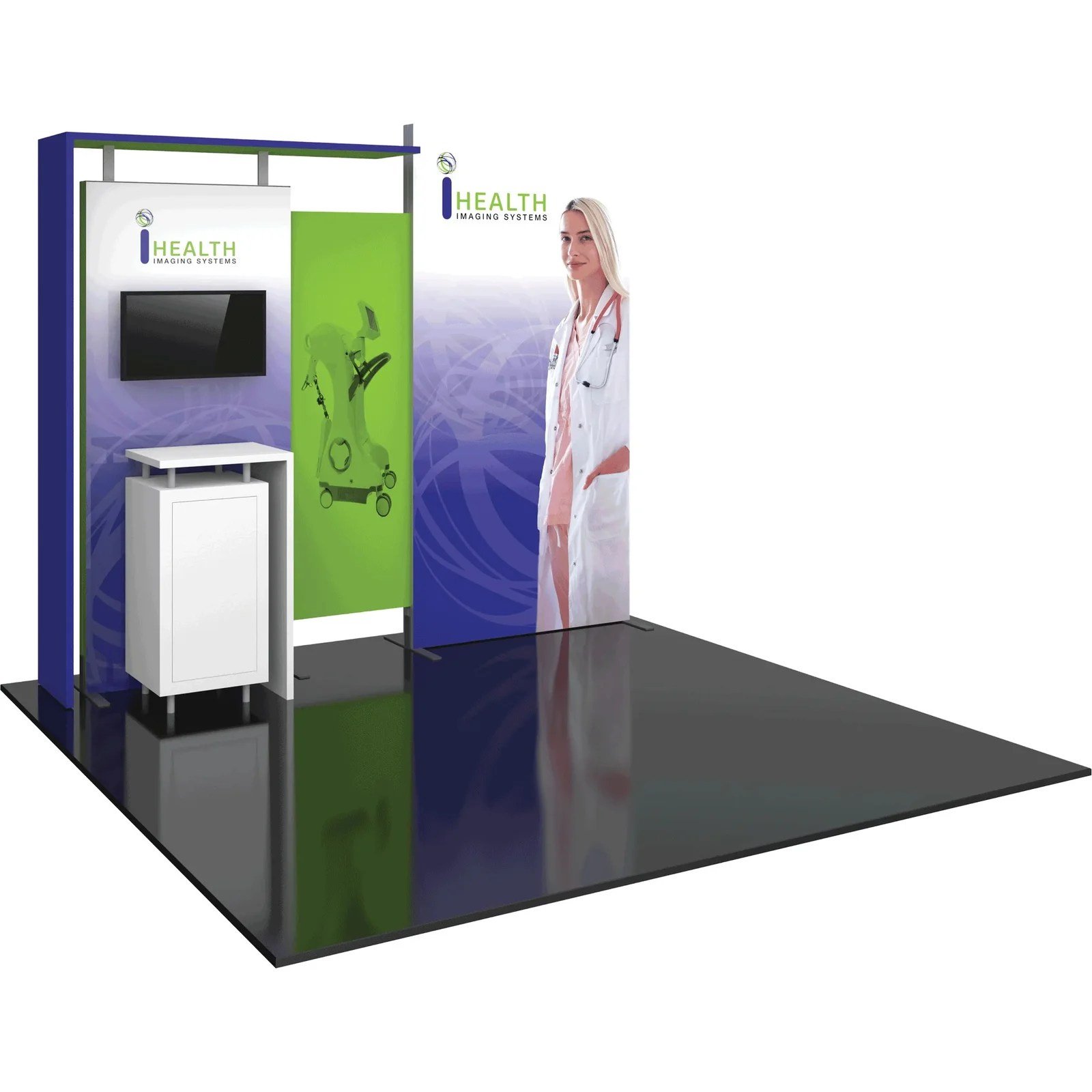 Hybrid Pro™ Modular Kit 03 is the ultimate 10ft x 10ft display kit solution. This custom modular display features high quality, push-fit graphics created with top-of-the-line technology, coupled with sturdy aluminum frames that are built to last. This display kit features a monitor mount and locking storage counter that can be further customized with graphics, as well as a fabric canopy and an illuminated panel to capture the attention of your audience.