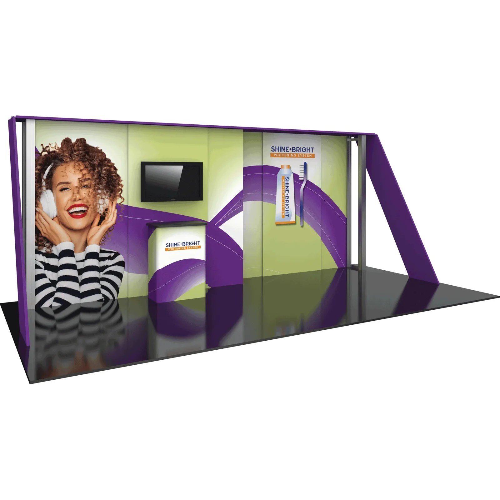 Hybrid Pro™ Modular Kit 15 provides a dynamic solution for your display needs. This 10ft x 20ft kit features durable aluminum frames and custom push-fit graphics, which combine with a central monitor mount and backwall storage counter for a functional, modern display. Side and top pillowcase fabric graphics add eye-catching accents to the display. Kit 15 is reconfigurable into 10ft x 10ft Kit 07, increasing the value, lifecycle and functionality of the exhibit.