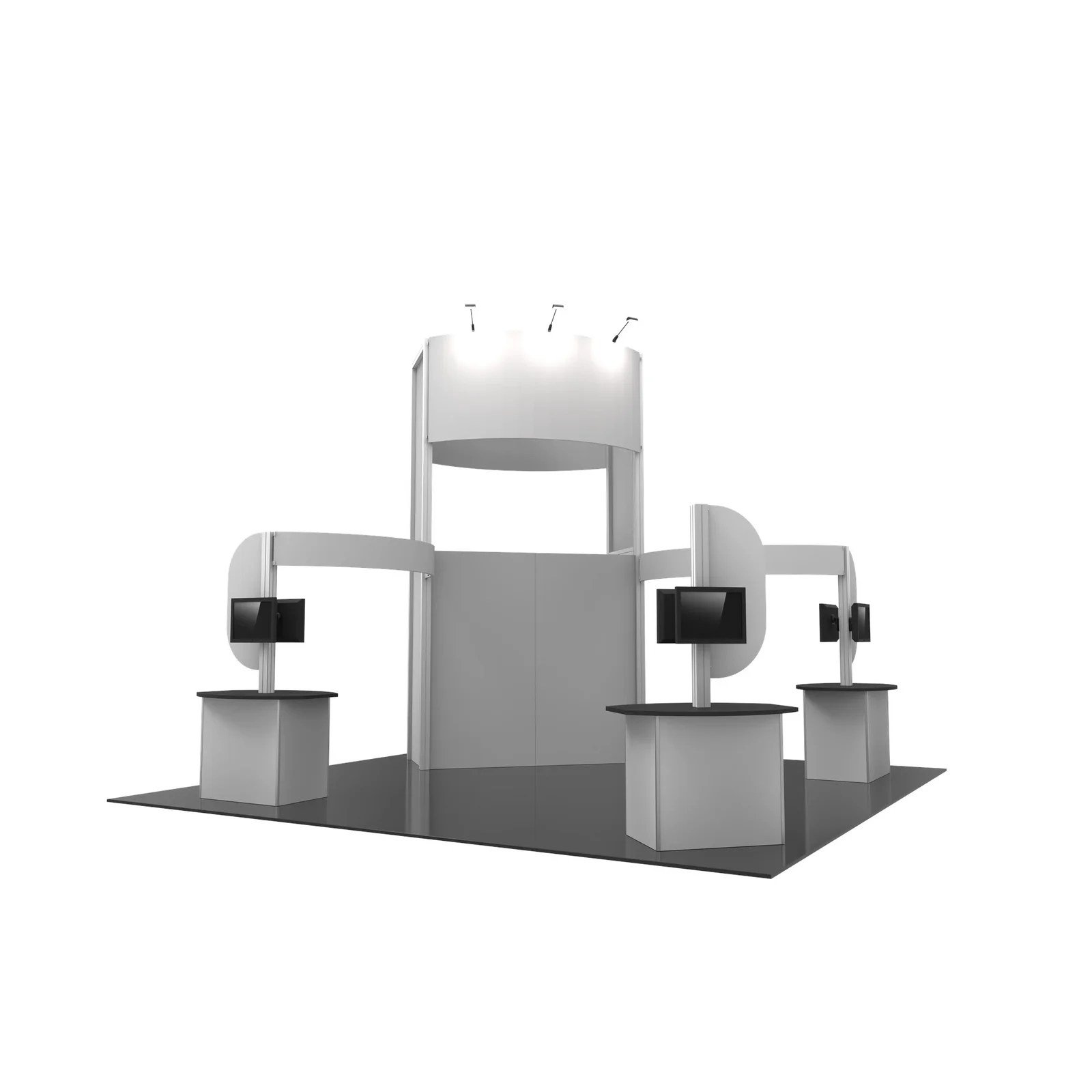 Hybrid Pro™ Modular Kit 17 is a striking 20ft x 20ft island exhibit, perfect for the serious exhibitor. Kit 17 features a heavy-duty aluminum extrusion frame coupled with seamless push-fit SEG fabric graphics. A 15′ 9″ central tower structure broadcasts your brand across the show floor, and two curved side arms provide additional room for displaying messaging. A trio of kiosks combining dual monitor mounts, rigid display panels and counters with locking storage provide additional room for messaging, functionality and storage. LED display lighting atop the central tower illuminates messaging for a clear display.