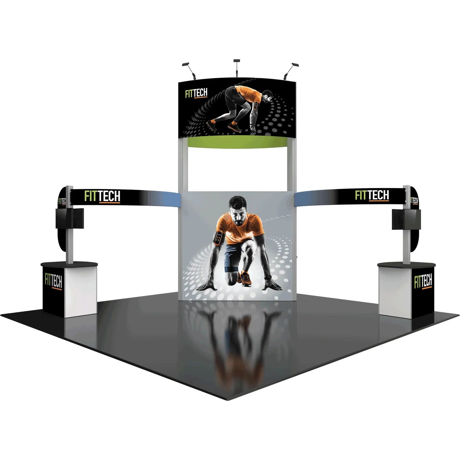 Hybrid Pro™ Modular Kit 17B is a striking 20ft x 20ft island exhibit that allows your brand to be seen up high without a rigging requirement. Kit 17B features a heavy-duty aluminum extrusion frame coupled with seamless push-fit SEG fabric graphics. A 15′ 9″ central tower structure broadcasts your brand across the show floor, and two curved side arms provide additional room for displaying messaging. Two connected kiosks combining dual monitor mounts, rigid display panels and counters with locking storage provide additional room for messaging, functionality and storage. LED display lighting atop the central tower illuminates messaging for a clear display.
