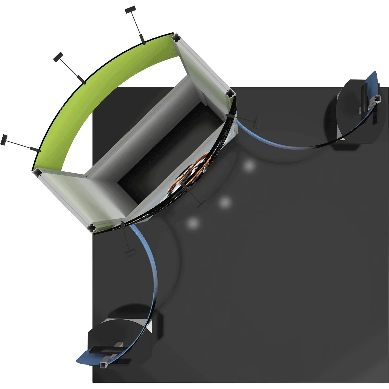 – Kit includes frame, accessible lockable storage space, two pillowcase graphics for top of structure, four push-fit fabric graphic panels, two shaped Sintra panels, two kiosks, four small monitor mounts*, six Lumina 200 LED floodlights