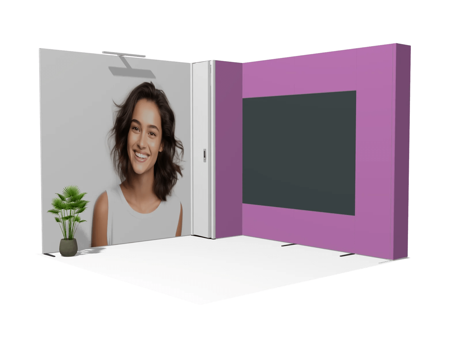 Immersive Environment PanoLED L-Classic 10×10 modular exhibit with brand-new SEG fabric graphics, complete booth hardware, shipping cases, lights, counters, and TV mount. Ships in 2 weeks from graphics approval, includes pre-build photos, supports multiple configurations, and delivers a reliable, immersive, stress-free trade show experience.