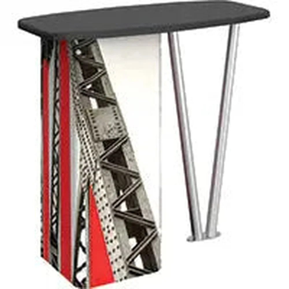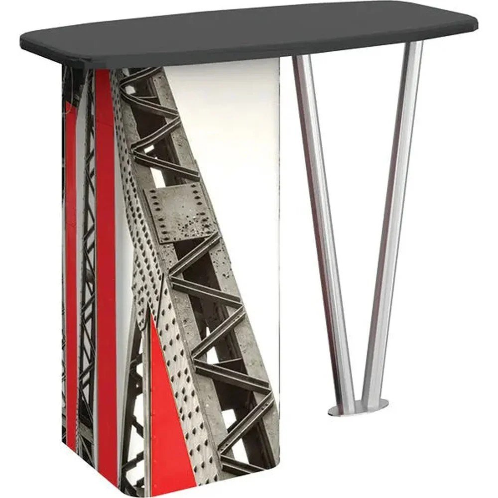 Orbus’s Vector Frame Counter Kit #7 has an eye-catching rectangular shaped counter-top with tapered edges and 2 legs are visible below the graphic. Legs make a V-Shape to the side of the wrap around rectangular counter. This counter also features a Locking Door and additional storage underneath with the back panel removed. Curved counter comes in 4 finishes and boasts a lifetime warranty on hardware. Graphics can be changed out season after season which makes this counter a great investiment for your exhibit kit.