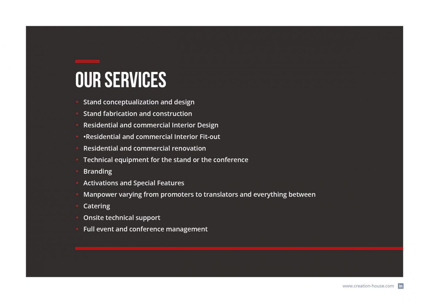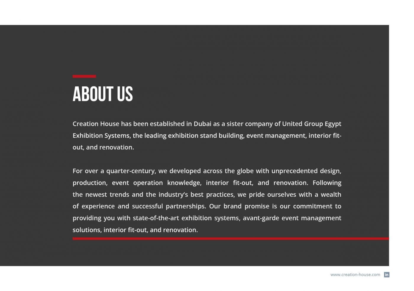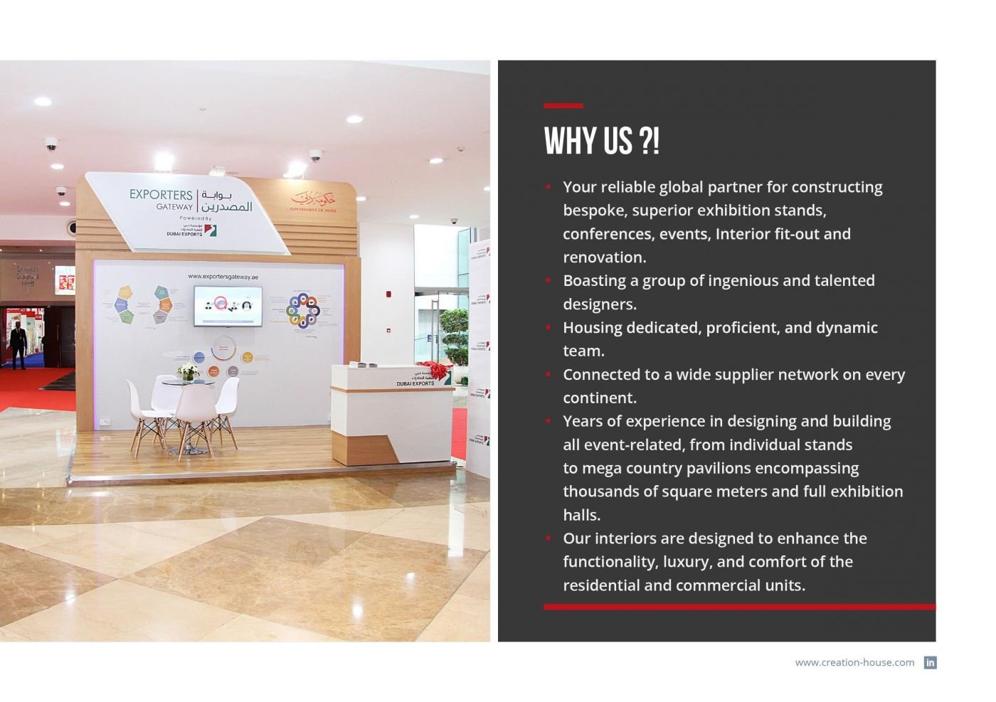 Your reliable global partner when it comes to Building Exhibition stand, Conferences and Events Most creative designers A dedicated professional dynamic team A strong supplier network worldwide Experience in designing and building small individual stands up to huge country pavilions encompassing thousands of square meters and full exhibition halls