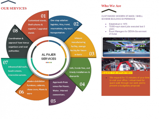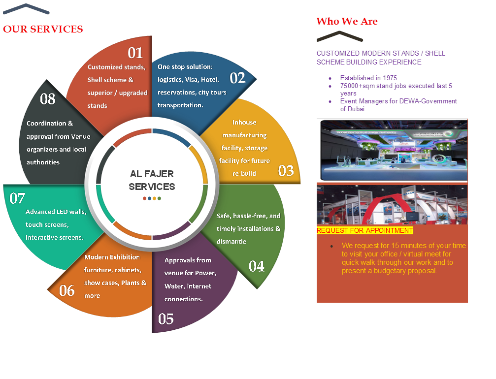 We are the first event company in the UAE, established by H.H. Sheik Hashar Al Maktoum, the ruling family of Dubai. We have been working on 75,000 square meters of shell schemes and customized stands for the last five years and have also acted as event’s organizers for Arab Plast, Paper Arabia and Pet Arabia. We can add value to your future events with our economical, modern, and customized designs. We completed 4500 square meter shells schemes at WETEX 2022 In addition to this, we have been selected as official contractors again for WETEX &DSS 2023 organized by DEWA -Government of Dubai. We have an in-house large factory and storage area . we can provide one stop solution to our customers from travel logistics to exhibition design as well as exhibit construction within budget price.